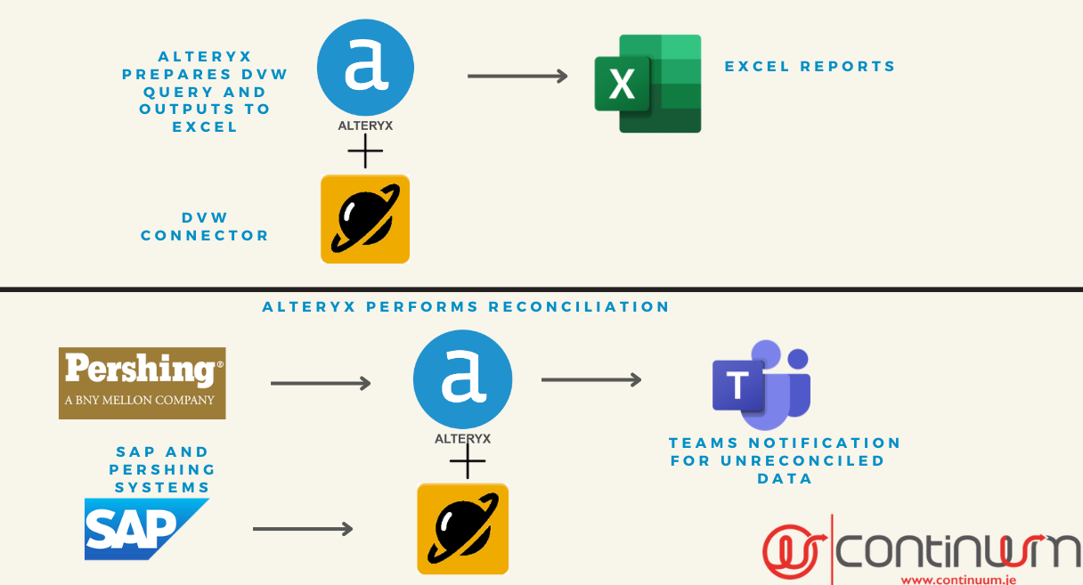 Alteryx can access the DVW Alteryx Connector to ingest this data while simultaneously connecting to the Pershing system and reconciling across accounts and clients. After this reconciliation all errors are sent to team members to notify them of any issues and an issue log is also created where it can be further analysed to mitigate future errors. This allows peace of mind that both systems contain correct and accurate data.